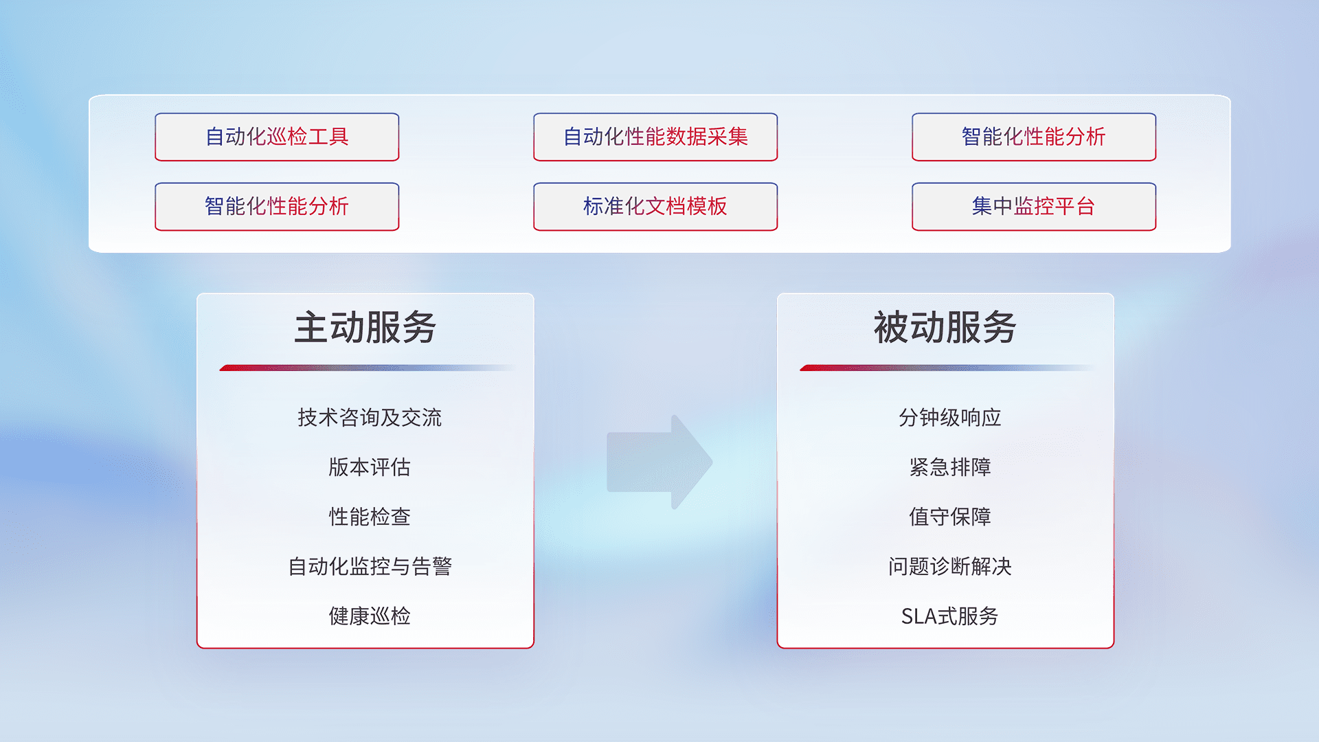 智能化工具和标准化文档,,保障服务质量,,提供主动服务(包含技术咨询、、版本评估、、、性能检查、、、、自动化监控与告警、、、健康巡检)和被动服务包含(分钟级响应、、、紧急排障、、、值守保障、、问题诊断解决、、、SLA服务)。。。。